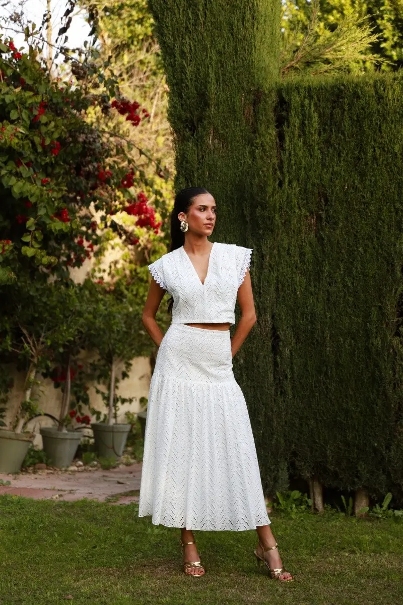 Para quienes buscan texturas más artesanales, el conjunto Sena es una elección sublime. Confeccionado en tejido de algodón bordado con forro al tono, este dos piezas presenta un top de escote en V con puntilla bordada y una falda de cintura marcada. Su silueta ajustada pero cómoda es ideal para esos días donde la elegancia discreta del Cloud Dancer marca la diferencia.