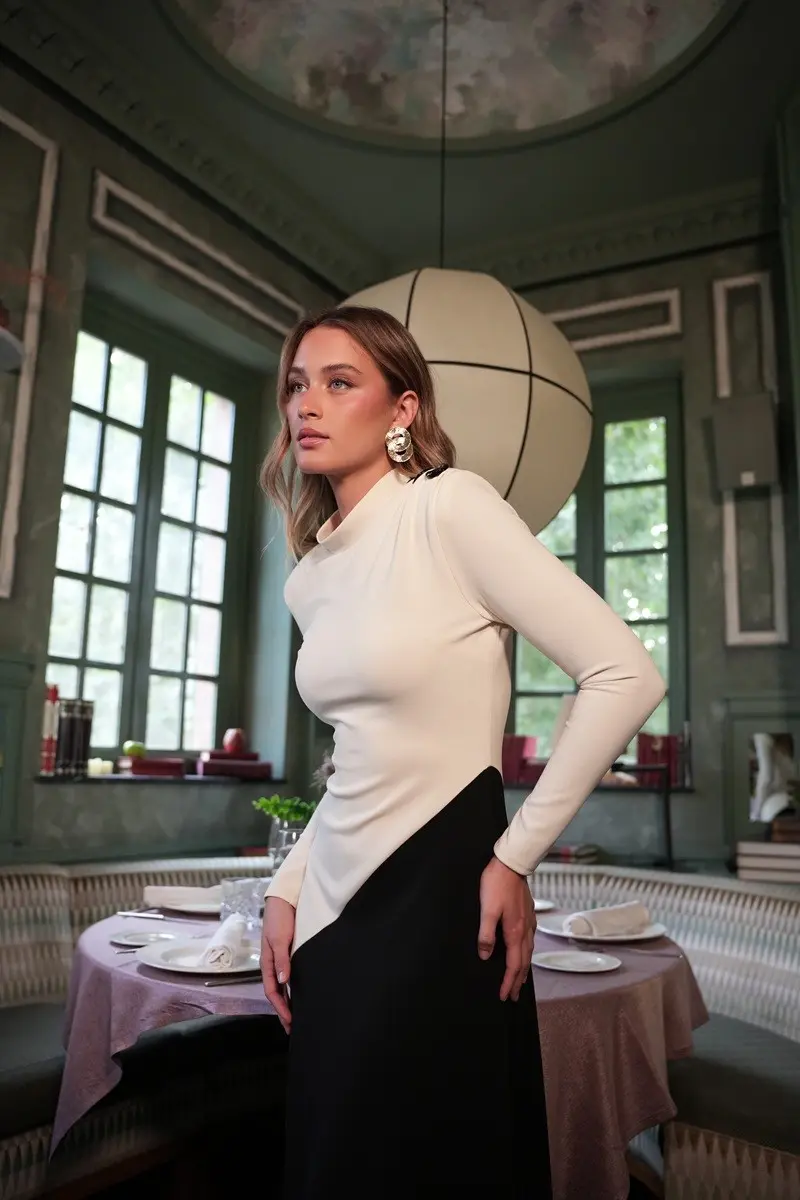 El vestido Kates es la apuesta por el refinamiento moderno. Este diseño midi en punto grueso combina el Cloud Dancer con el negro en un corte diagonal que realza la silueta. Su estructura entallada, manga larga y cuello cerrado aportan un equilibrio armónico, convirtiéndolo en un look atemporal que respira la sofisticación que Pantone vaticina para 2026.