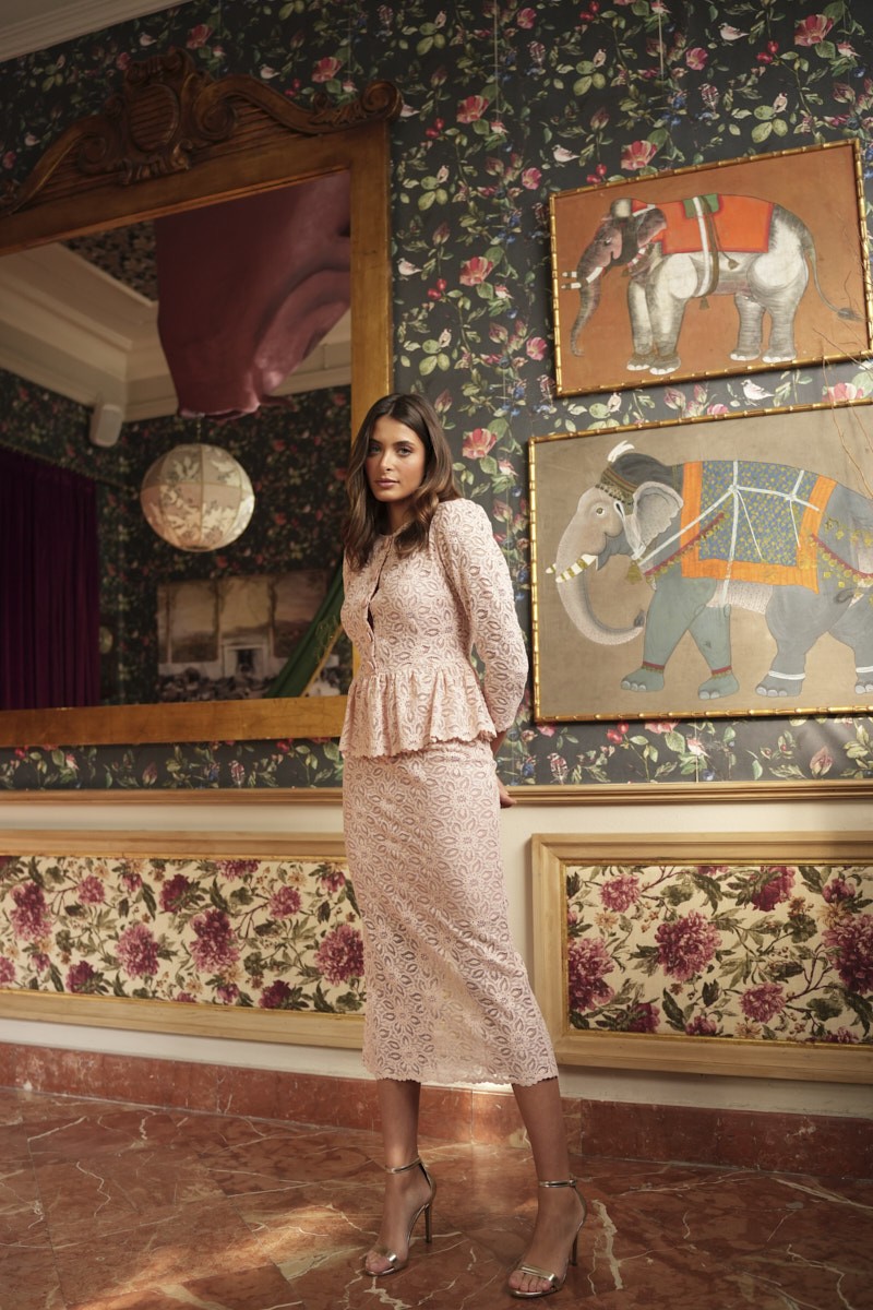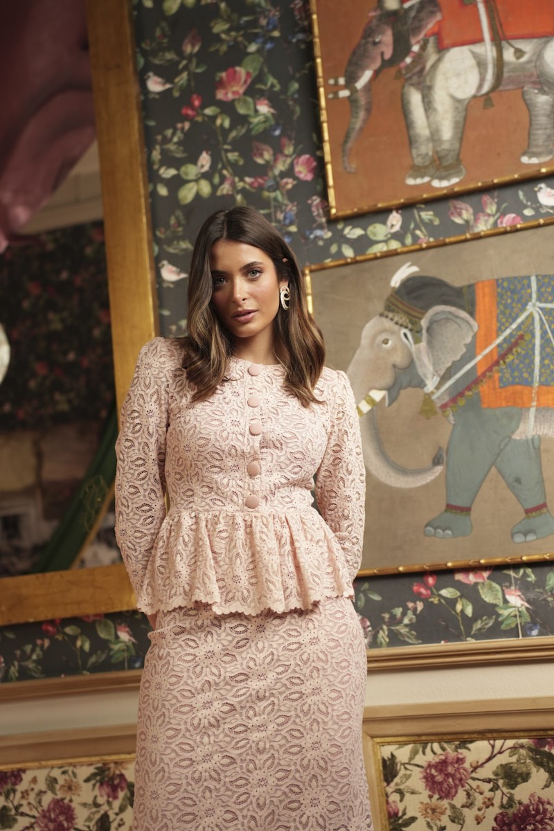 El conjunto Alanis está confeccionado en tejido de macramé, aportando textura y elegancia al diseño. La falda lápiz midi forrada estiliza la silueta, mientras que el top con botones forrados, el volante bajo tipo peplum y la hombrera realzan la figura con un acabado sofisticado. Incluye forro interior para mayor comodidad y una caída impecable.