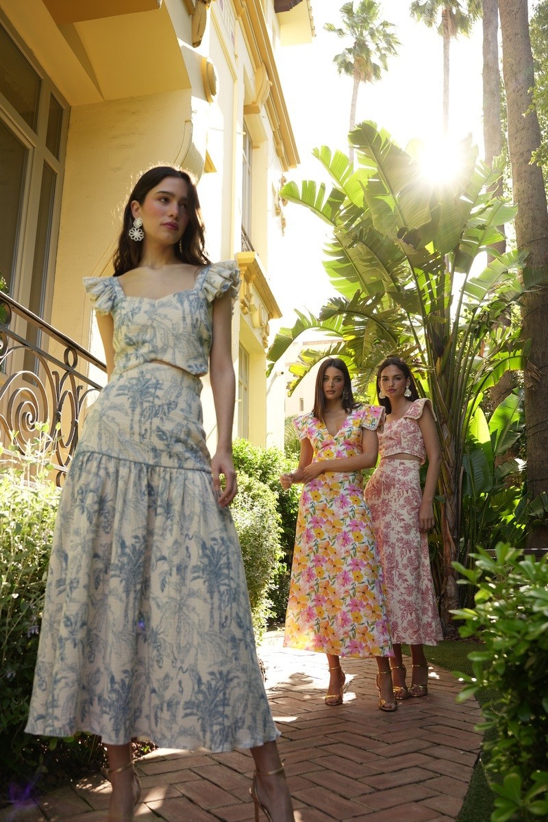 El conjunto Cartuja está confeccionado en tejido de algodón. El top destaca por los volantes de los hombros y la cremallera dorada en espalda con apertura total para comodidad. Lleva un detalle en las tirantas de vivo azulina. La falda con corte a la cadera acaba con un frunce y vuelo. También tiene el detalle del vivo azulina y cremallera dorada a juego.