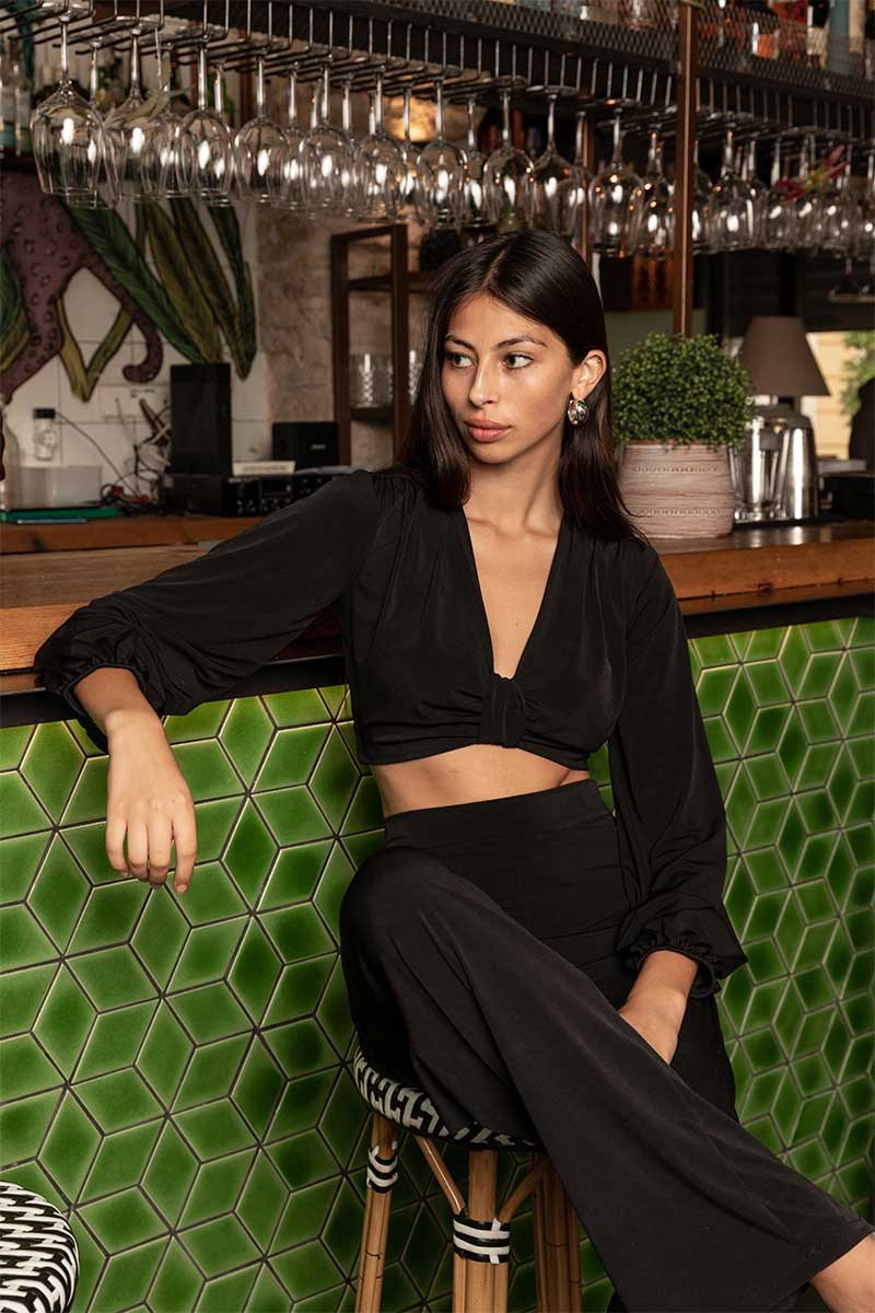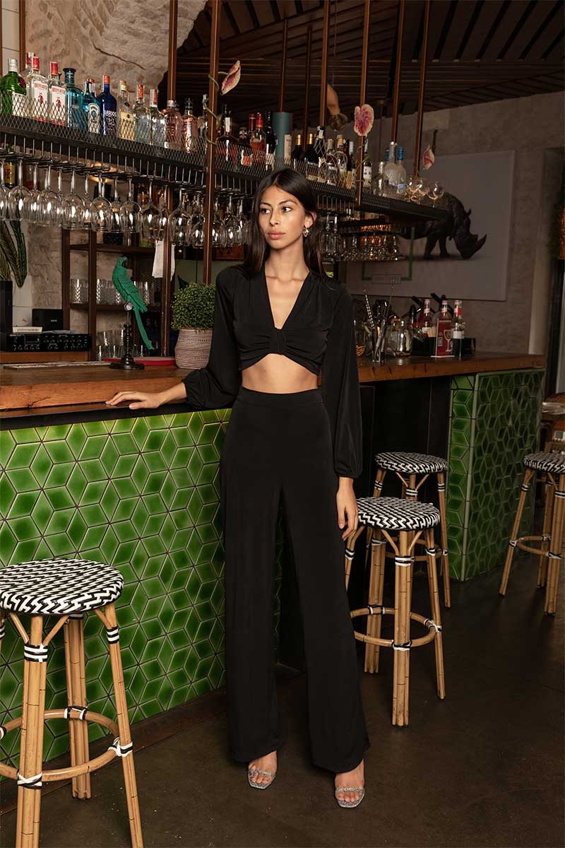 El conjunto Mariana, diseñado en Cayro Woman, está confeccionado con tejido de punto de poliéster negro. Top de manga larga y frunce en hombros. Elástico en puños y espalda. Pantalón palazzo con cinturilla y cremallera invisible en lateral.