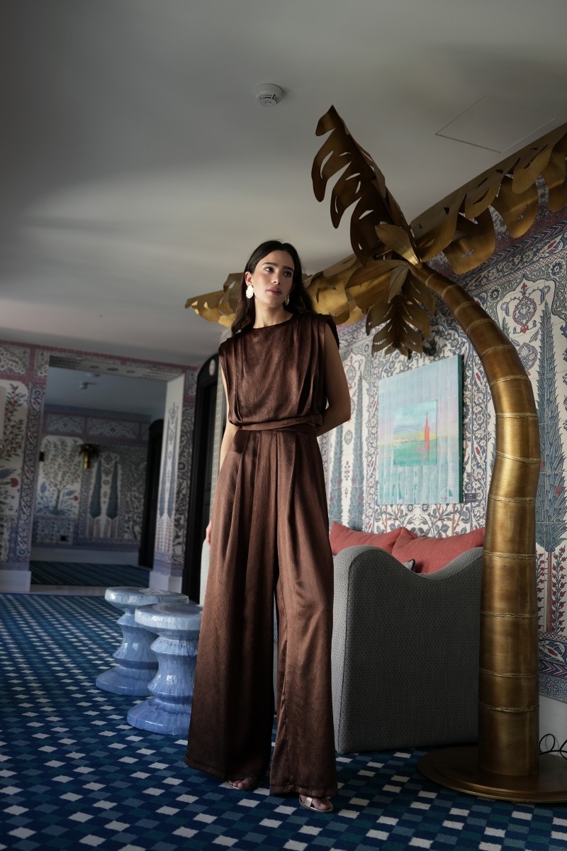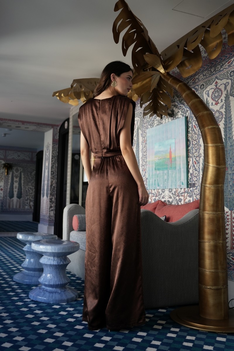 Compuesto por un pantalón fluido y un top estructurado en color chocolate, ofrece una silueta moderna y favorecedora que resulta perfecta para bodas, fiestas o cenas especiales.
