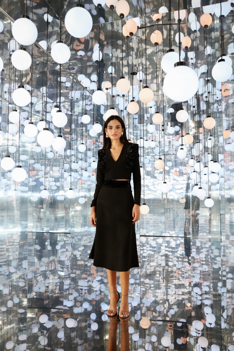 El conjunto Sarma está confecciónado en tejido bioelástico con lentejuelas. Falda midi con cintura de lentejuelas. Top con detalle de solapas en lentejuelas. Cremallera invisible en espalda.