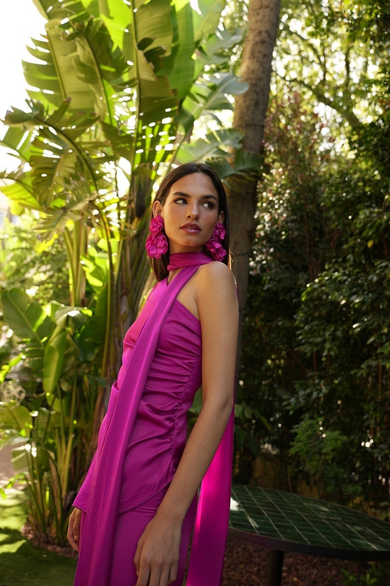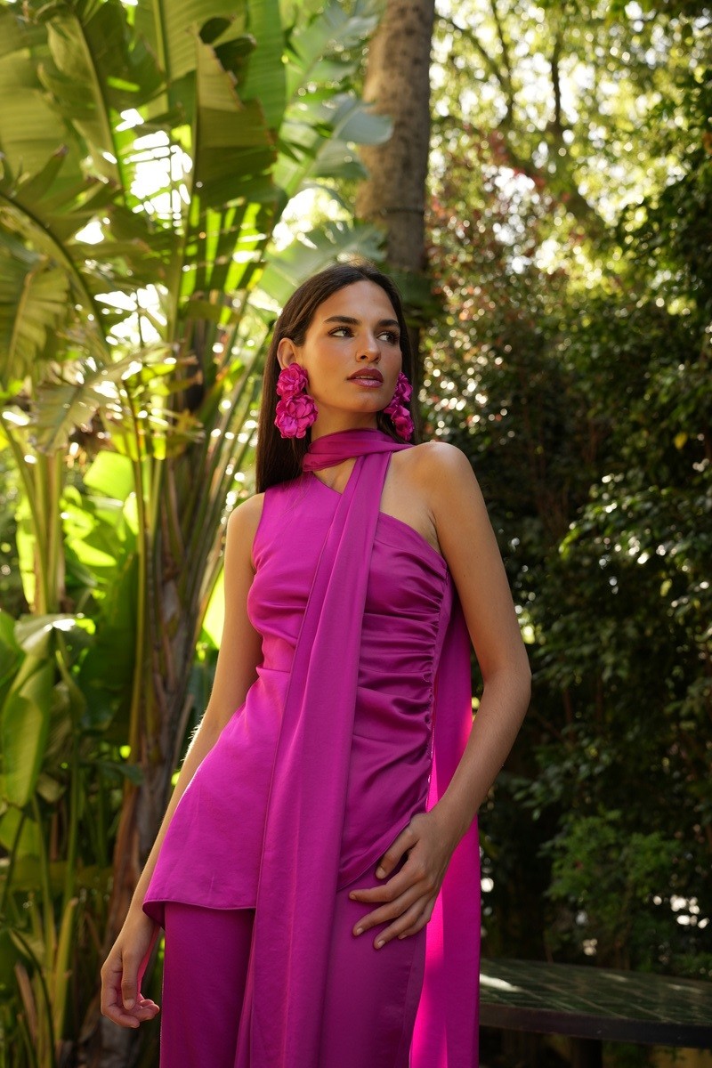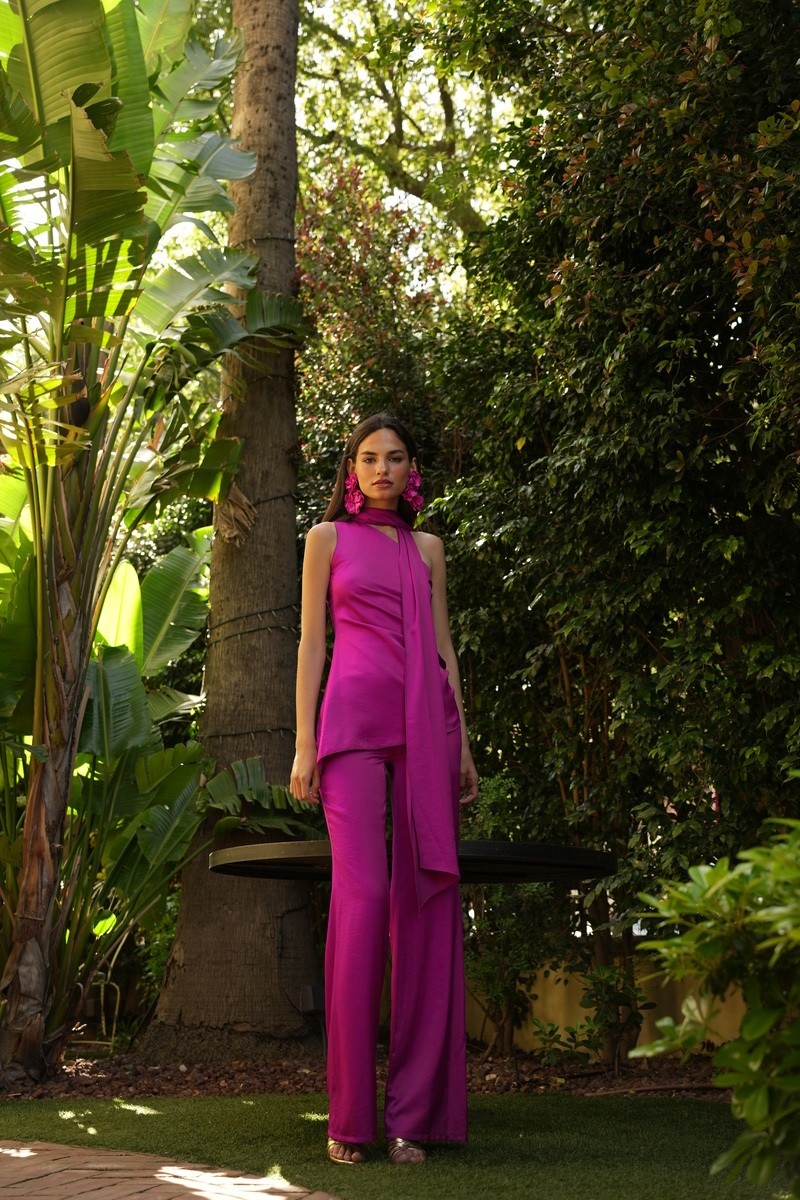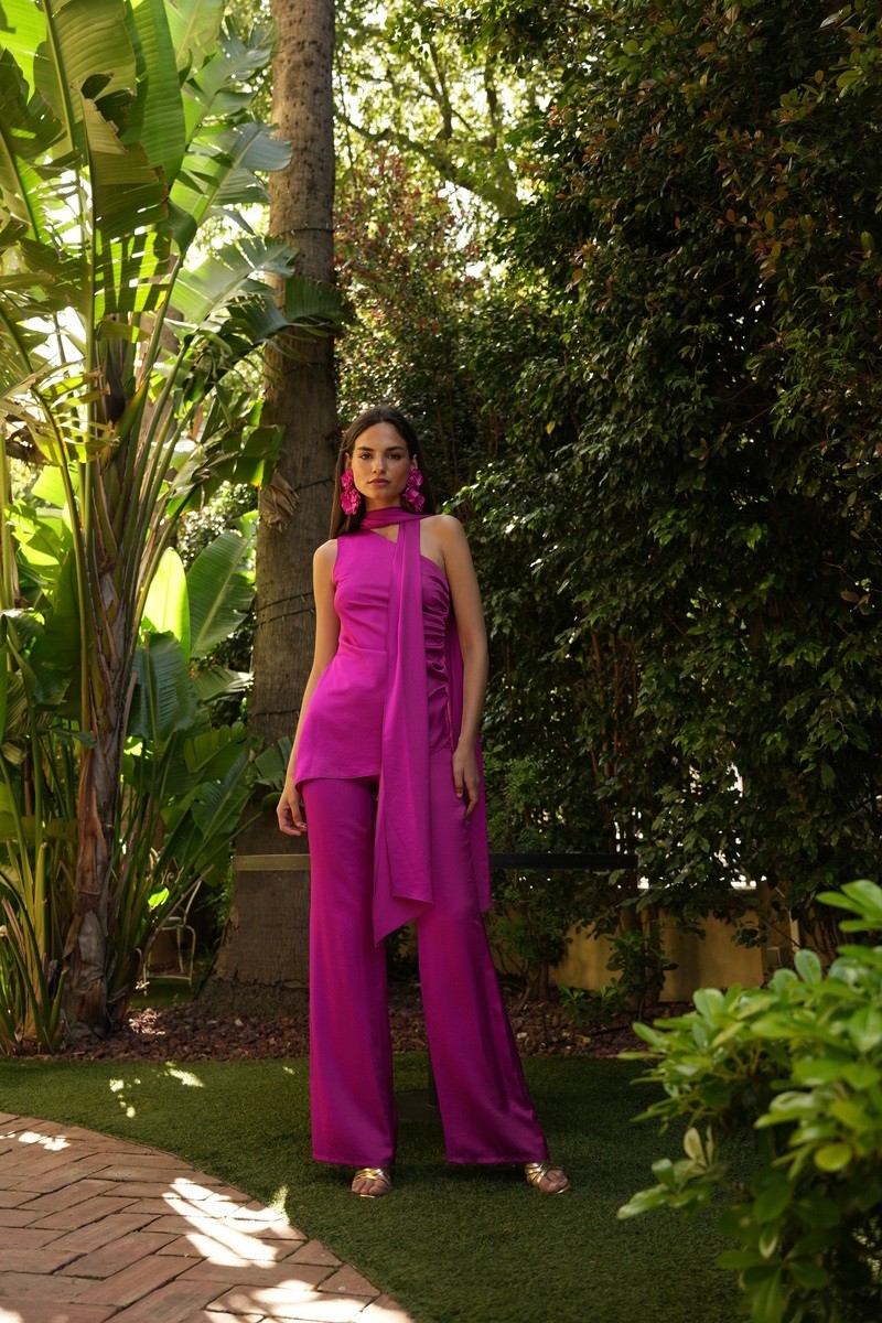 El conjunto Seúl está confeccionado en tejido de raso. Top asimétrico con drapeado lateral y lazo. Pantalón de tiro alto con cremallera invisible lateral.