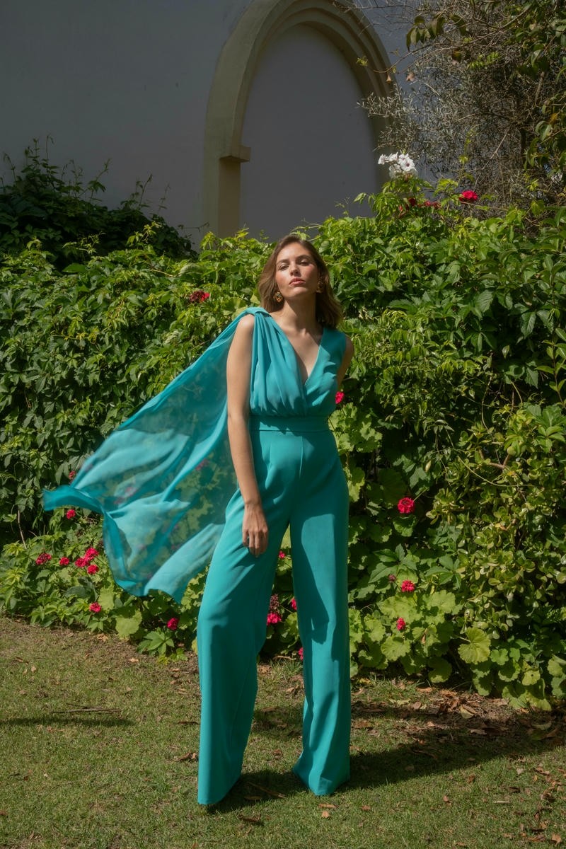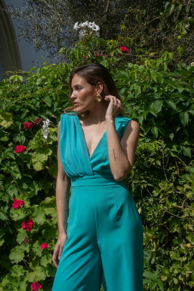 El mono Asuán de Cayro Woman está confeccionado con tejido bioelástico azul en contraste con tejido de gasa al tono. Amplio escote cruzado con detalle gasa que hace de capa. Cremallera invisible en espalda.