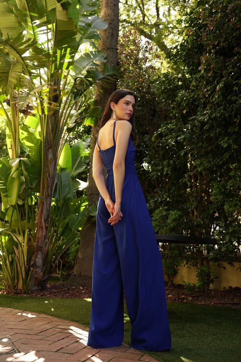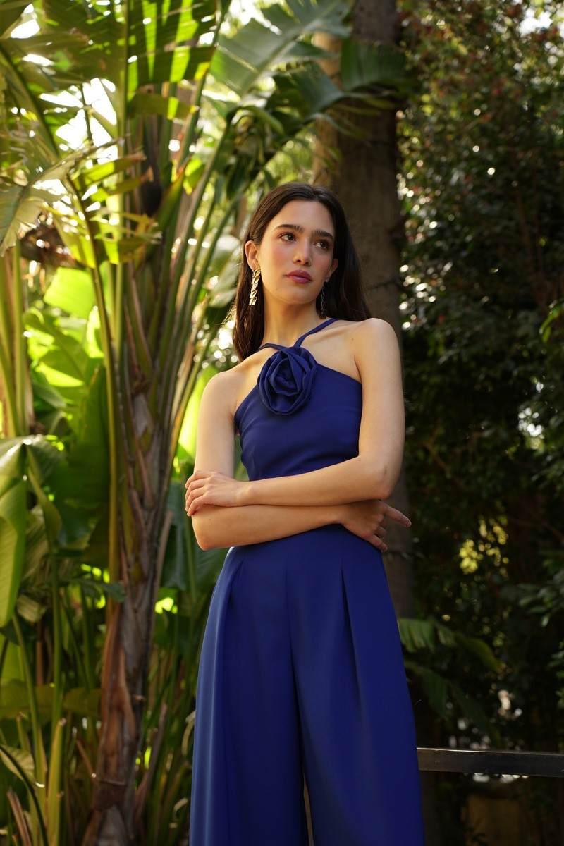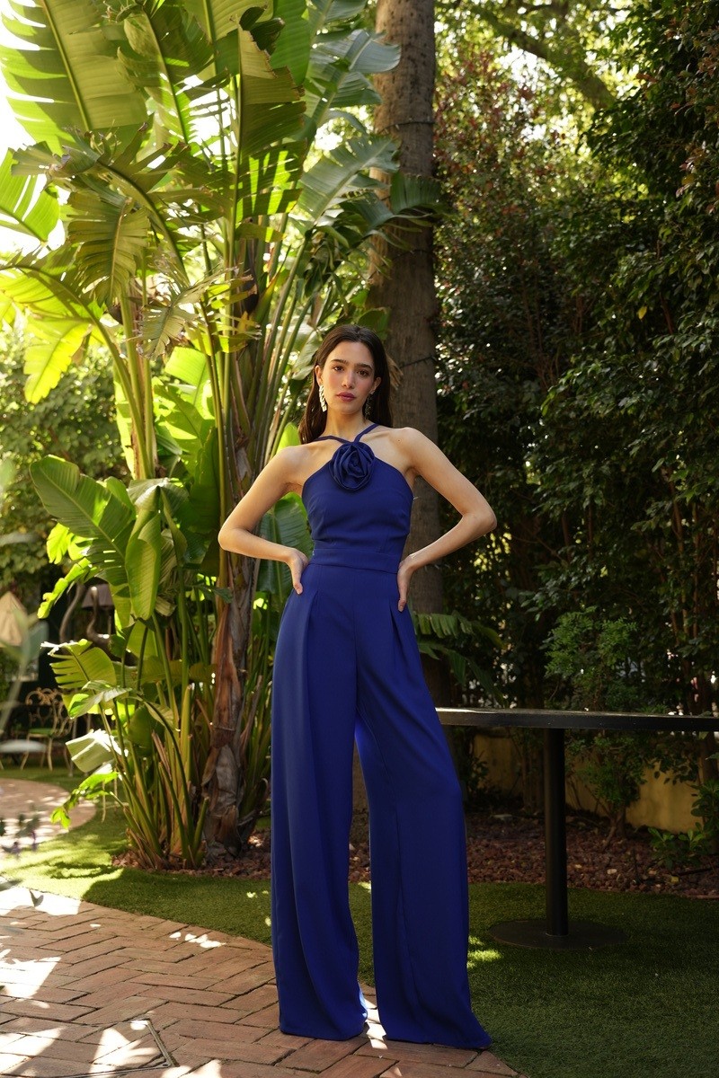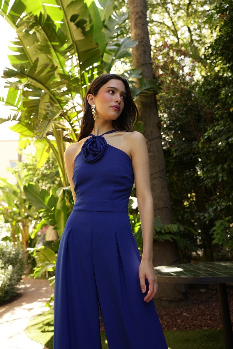Está confeccionado en tejido de crep. Destaca su original escote rematado por una rosa del mismi tejido. Su corte entallado en cintura y pantalon tipo palazzo es súper favorecedor. Lleva cremallera invisible en espalda.