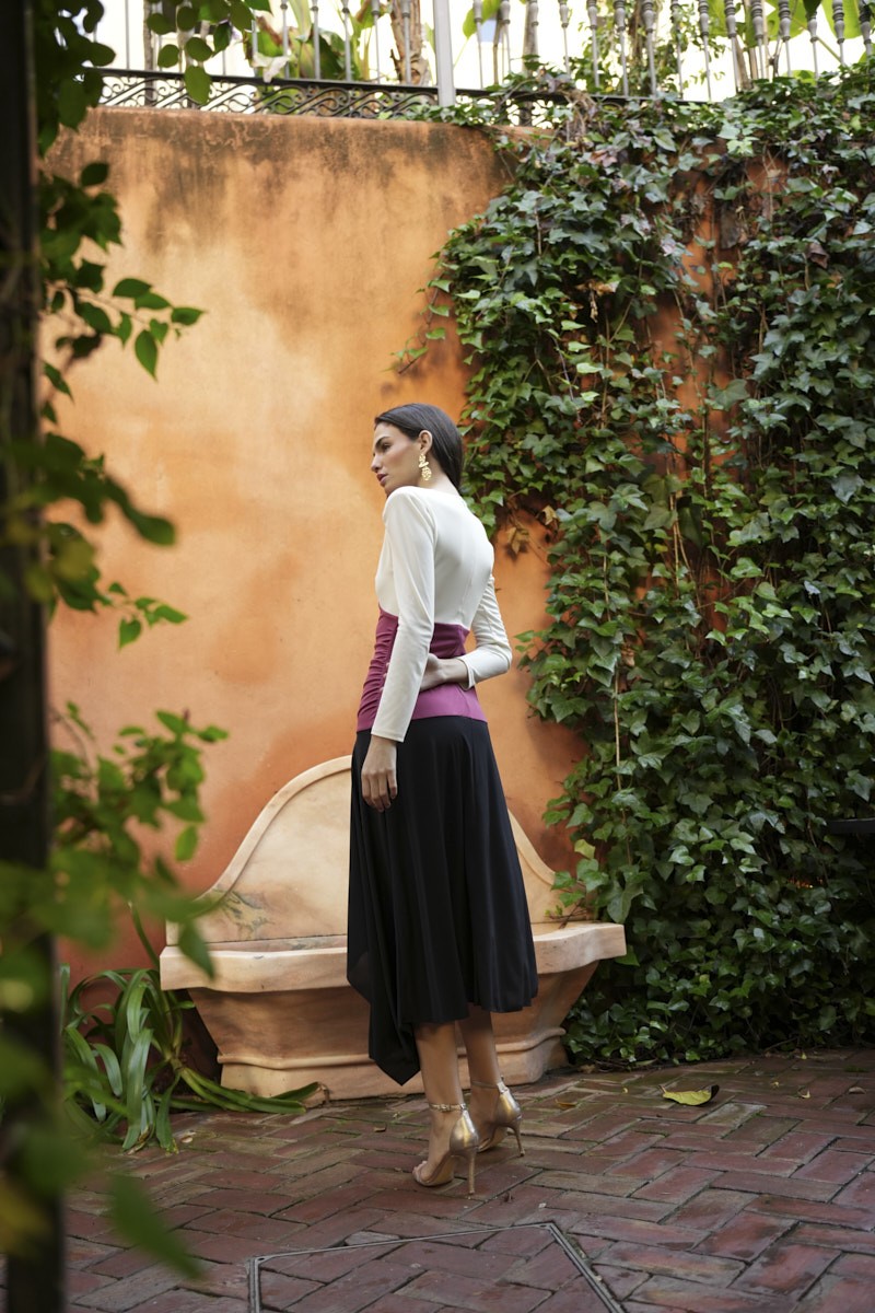 El Vestido Slam destaca por su diseño tricolor y su confección en tejido de punto de seda, que aporta suavidad y una caída fluida. Su escote en V, la hombrera y el drapeado en la cintura estilizan la silueta, mientras que la cremallera trasera garantiza un ajuste cómodo.