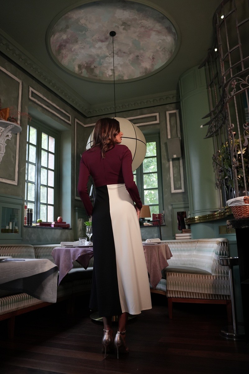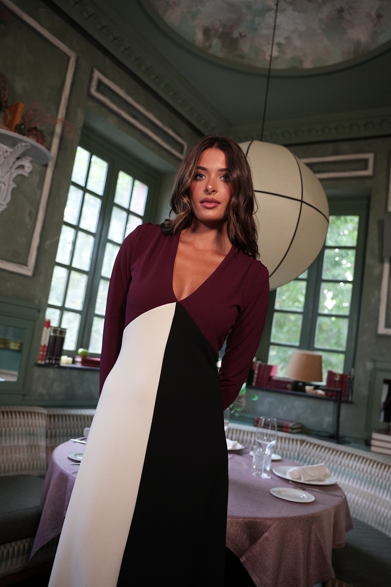 El vestido Yinaredefine la elegancia moderna con un diseño de líneas puras y contraste de tonos sofisticados. Su combinación en burdeos, blanco y negro aporta profundidad visual y un efecto estilizado único. Este modelo equilibra feminidad y sobriedad, convirtiéndose en una opción ideal para bodas, cócteles o celebraciones de otoño e invierno.